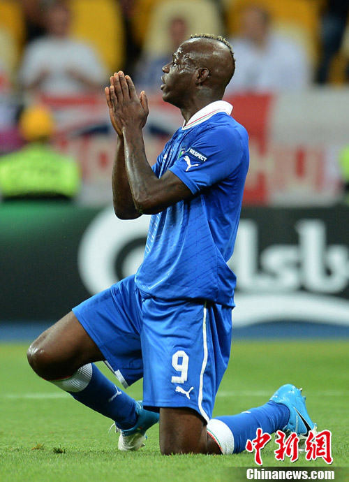 當(dāng)?shù)貢r(shí)間24日晚,2012年歐洲杯進(jìn)行了最后一場(chǎng)四分之一決賽。最終,意大利隊(duì)(藍(lán)衣)在點(diǎn)球大戰(zhàn)中4比2戰(zhàn)勝英格蘭隊(duì),鎖定最后一個(gè)四強(qiáng)席位。圖為意大利話題球員巴洛特利。