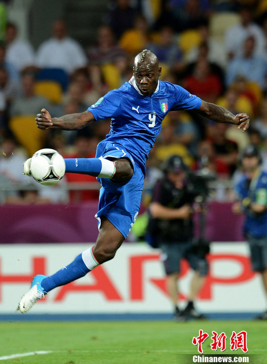 當(dāng)?shù)貢r(shí)間24日晚,2012年歐洲杯進(jìn)行了最后一場四分之一決賽。最終,意大利隊(duì)(藍(lán)衣)在點(diǎn)球大戰(zhàn)中4比2戰(zhàn)勝英格蘭隊(duì),鎖定最后一個(gè)四強(qiáng)席位。圖為意大利話題球員巴洛特利。