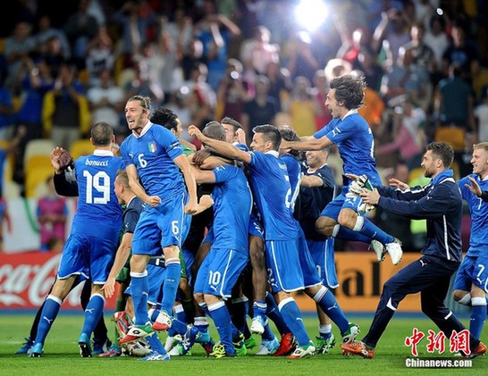 當?shù)貢r間24日晚,2012年歐洲杯進行了最后一場四分之一決賽。最終,意大利隊(藍衣)在點球大戰(zhàn)中4比2戰(zhàn)勝英格蘭隊,鎖定最后一個四強席位。圖為意大利隊慶祝晉級。