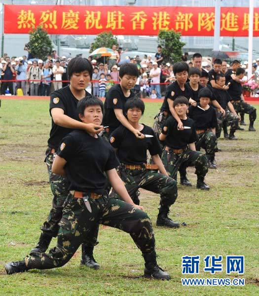 ????4月28日,首次參與表演的駐港部隊女子特戰(zhàn)隊隊員在演練。當日,中國人民解放軍駐香港部隊為慶?!拔逡弧眹H勞動節(jié)及香港回歸祖國、解放軍進駐香港15周年,在昂船洲軍營舉行一連兩天的“軍營開放日”活動,吸引了約1.3萬名香港市民入營參觀。(記者 黃本強 攝)