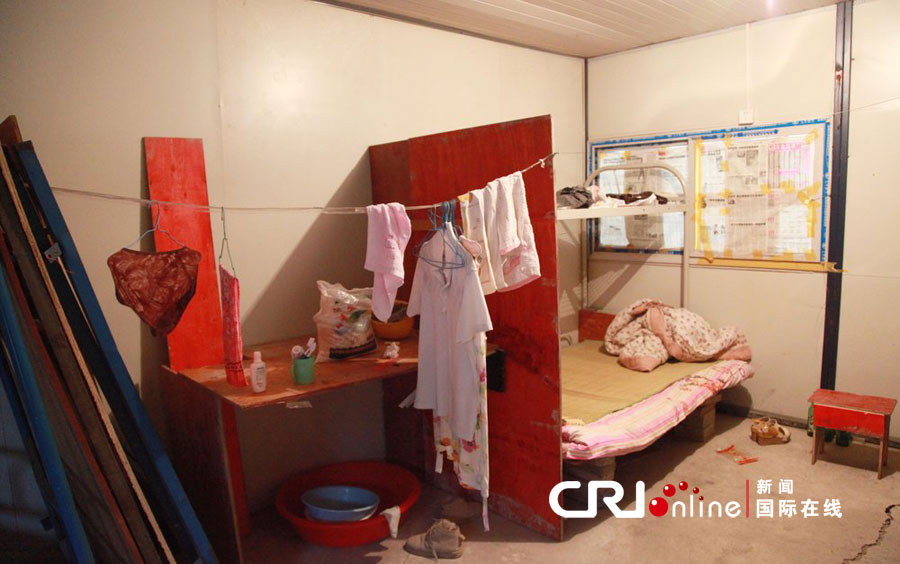 其中一間來(lái)自合肥工友的夫妻房,窗戶(hù)用報(bào)紙糊著代替窗簾,室內(nèi)拉了一根繩子晾曬衣服,生活用品零散的擺放在夫妻房?jī)?nèi)。
