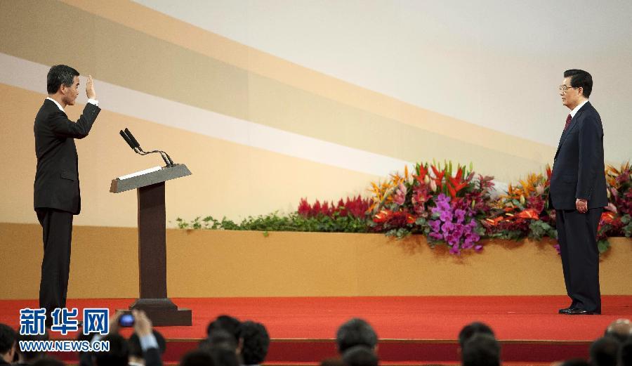 香港特區(qū)第四屆政府就職典 7月1日,中共中央總書記、國家主席、中央軍委主席胡錦濤出席慶祝香港回歸祖國15周年大會暨香港特別行政區(qū)第四屆政府就職典禮。這是由胡錦濤監(jiān)誓,香港特別行政區(qū)第四任行政長官梁振英宣誓就職。新華社記者呂小煒攝