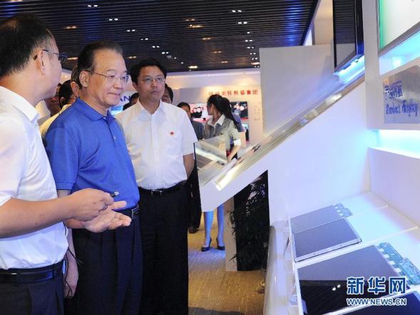 7月6日至8日,中共中央政治局常委、國(guó)務(wù)院總理溫家寶來(lái)到江蘇省常州、鎮(zhèn)江、南京等地就當(dāng)前經(jīng)濟(jì)形勢(shì)進(jìn)行調(diào)研,并在南京主持召開遼寧、江蘇、浙江、安徽、廣東五省經(jīng)濟(jì)形勢(shì)座談會(huì)。這是7月7日,在中電熊貓液晶顯示科技有限公司產(chǎn)品展廳,溫家寶向企業(yè)負(fù)責(zé)人詳細(xì)詢問(wèn)企業(yè)平板顯示技術(shù)自主產(chǎn)權(quán)情況。