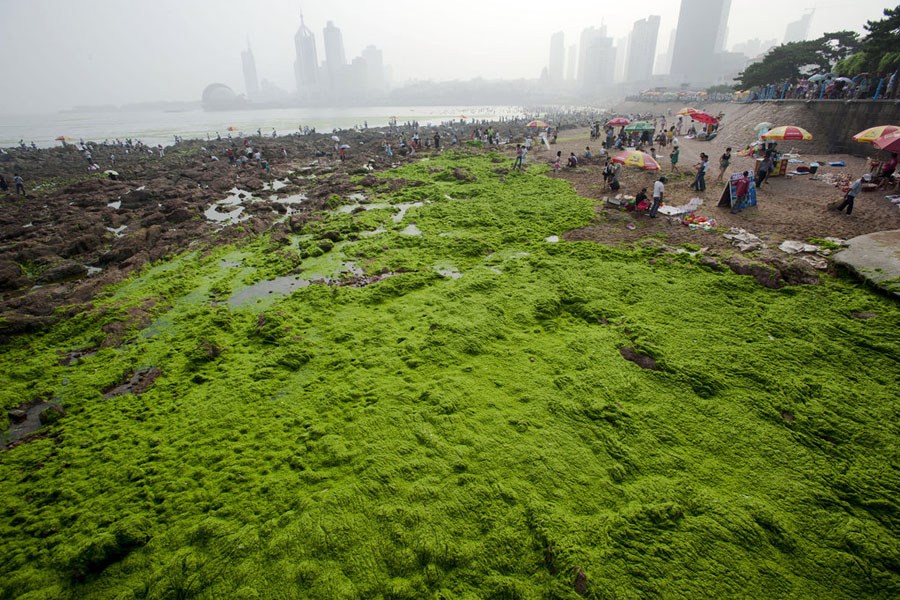 青島棧橋東側(cè)海邊再現(xiàn)成片滸苔 似廣袤草原