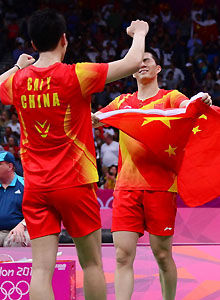????北京時(shí)間8月5日晚21時(shí)55分,倫敦奧運(yùn)會(huì)羽毛球男雙決賽在溫布利體育館壓軸上演。在這場收官的男雙金牌爭奪戰(zhàn)中,中國男雙的領(lǐng)軍人物、四屆世錦賽冠軍蔡赟/傅海峰令“中國風(fēng)暴”席卷溫布利。他們?cè)跊Q賽中以2-0(21-16,21-15)力克實(shí)力強(qiáng)勁的丹麥名將鮑伊147/摩根森,中國隊(duì)首次獲得奧運(yùn)會(huì)羽毛球男雙冠軍,他們史無前例的實(shí)現(xiàn)了包攬奧運(yùn)會(huì)羽毛球五枚金牌的壯舉!