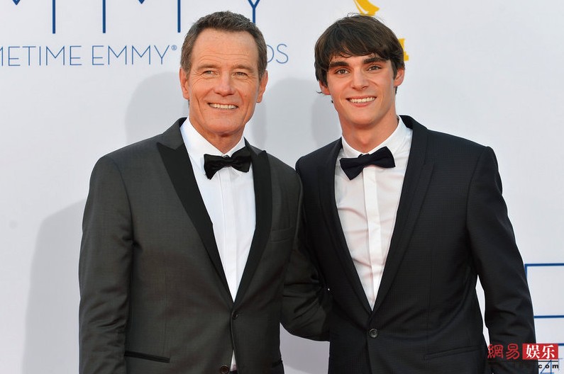 《絕命毒師》主演布萊恩·科蘭斯頓(左)與RJ在一起,他們在劇中飾演父子