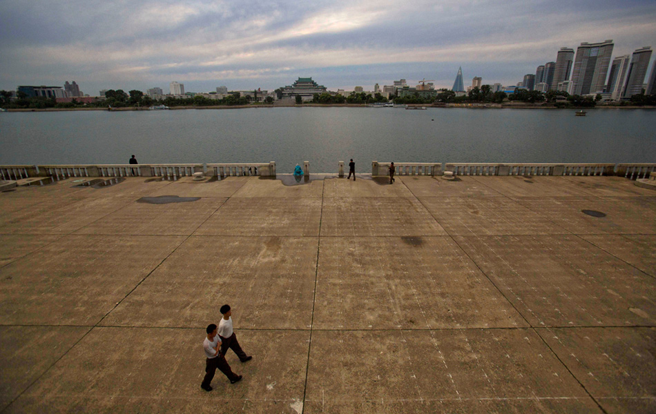 平壤,在大同江邊行走的民眾。David Guttenfelder/攝