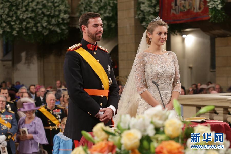 10月20日,盧森堡大公儲(chǔ)紀(jì)堯姆(左)與大公儲(chǔ)妃斯蒂芬妮(右)在盧森堡圣母大教堂舉行宗教婚禮。新華社發(fā)(盧森堡大公府提供照片)