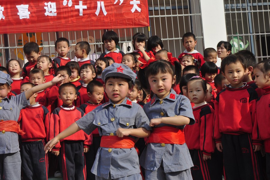 10月31日,江西省德興市泗洲鎮(zhèn)銅礦中心幼兒園200名小朋友在老師的指揮下齊聲合唱紅歌,一群穿紅軍服的小朋友載歌載舞迎十八大。