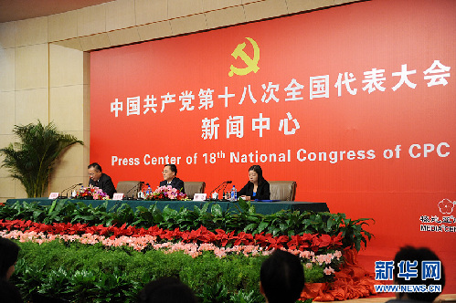 2012年11月9日,十八大新聞中心舉行記者招待會,請中共中央組織部副部長王京清介紹黨的建設(shè)工作,并回答記者提問。圖為記者會現(xiàn)場。新華網(wǎng)陳競超 攝