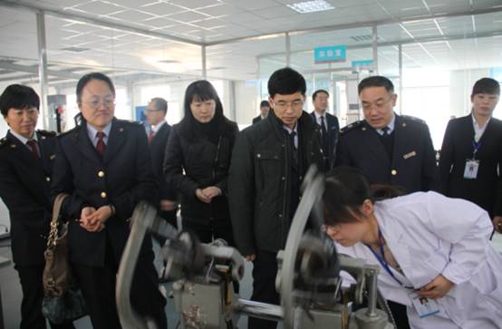 審核專家組組長、煙臺檢驗檢疫局輕紡處處長邢玉信(左一)等專家,對亨達股份生產現進行審查