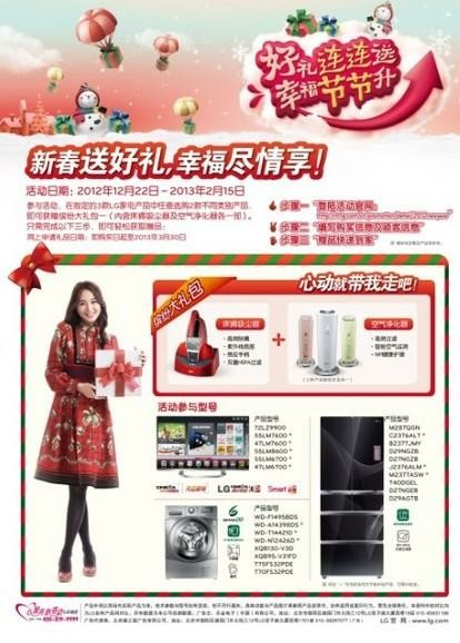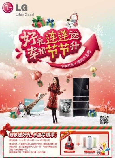 ????節(jié)能補貼+繽紛大禮包 ????LG年末促銷狂歡盛裝登場。多重節(jié)能補貼帶給你十足實惠,更有繽紛豪禮相送,LG家電傾心為你打造智能、清新又健康的溫暖冬日,喜迎春節(jié)。即日(12.22)起至2013年2月15日,只要購買LG部分型號的洗衣機、冰箱或Cinema 不閃式3D電視產(chǎn)品中的任意兩款不同類別的產(chǎn)品,即可獲贈包含床褥吸塵器及空氣凈化器各一部的繽紛大禮包。另外,購買符合國家一級節(jié)能標(biāo)準(zhǔn)的LG冰洗產(chǎn)品,還能最多享受800元的現(xiàn)金優(yōu)惠! ????LG超大容量滾筒洗衣機 新春掃除好幫手