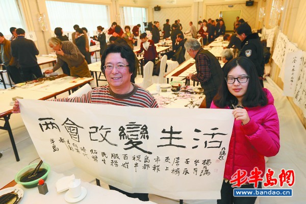 ????1月6日,參加市政協(xié)十二屆二次會(huì)議的委員們相繼趕往黃海飯店、八大關(guān)賓館報(bào)到 。連日來一直關(guān)注著本報(bào)“幸福進(jìn)家”活動(dòng)的市政協(xié)委員、市書法家協(xié)會(huì)副主席楊乃瑞,率先將自己的一幅作品捐了出來,要為貧困家庭出一份力,在場的很多書畫家也揮毫潑墨,表示要捐助自己的作品奉獻(xiàn)愛心。