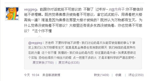 如果真想做這個(gè)實(shí)驗(yàn),恐怕也得找個(gè)相當(dāng)大的樓,點(diǎn)一把差不多的火,才是本著科學(xué)的嚴(yán)謹(jǐn)態(tài)度吧……”而方舟子也不甘示弱,引用王菲的句式寫道“你不要信仰地不講理”,并連用三個(gè)反問句駁斥王菲的看法,末了更以“這個(gè)‘你不懂,我懂的’,一頂禮還真覺得自己上層次了”直接“質(zhì)疑”王菲的“層次”,并將話題擴(kuò)散到“信仰和教養(yǎng)的關(guān)系”,稱:“誰說宗教信仰能提高人的教養(yǎng)的,到網(wǎng)上看仔