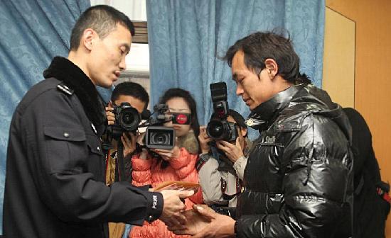 圖為2月4日,上海新涇派出所民警將市民歸還的部分款項4100元人民幣歸還給失主秦先生。董俊 攝