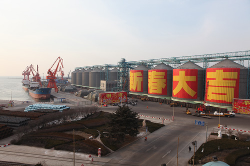 ??? 在青島港,飽含著吉祥和祝福的“新春大吉”四個(gè)大字在青島港老港區(qū)糧罐上高高掛起。這代表著青島港向一年來支持港口發(fā)展的船東、貨主、各界賓朋及廣大員工送上新年最真摯的祝福。據(jù)了解,每個(gè)大字為575平方米,四字總計(jì)2300平方米,為全國(guó)最大祝福語(yǔ)。