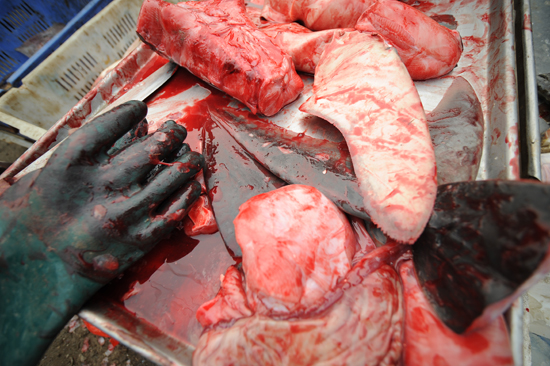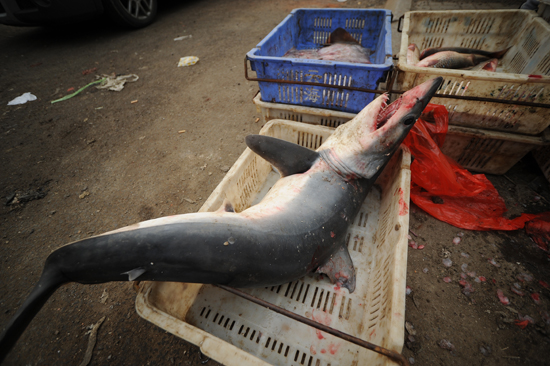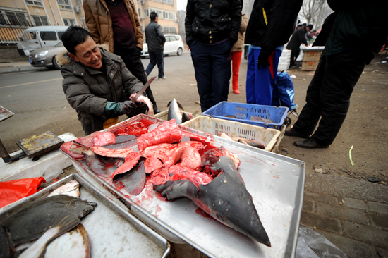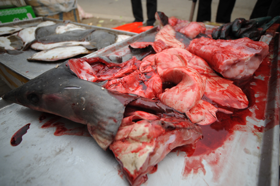 “鯊魚肉14元一斤,魚翅130塊”攤販告訴記者,鯊魚肉很好吃,回家可以包餃子,味道特別鮮美。當(dāng)記者詢問鯊魚的來源時,男子表示“昨天剛從海上打回來的”,再沒有多說。由于場面血腥引起了不少市民圍觀猜測,不少圍觀者覺得,鯊魚應(yīng)該屬于保護動物,不能隨便捕撈食用。(記者 張力偉 攝)
