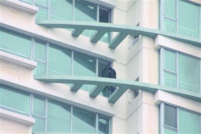 ????記者趕到現(xiàn)場(chǎng)時(shí),119消防隊(duì)員已經(jīng)在樓下防護(hù)。許多市民站在路邊觀察事件的進(jìn)展,此時(shí)這名女子坐在裝飾平臺(tái)的最外側(cè),一條腿放在身前的連接臺(tái)上,一條腿幾乎懸在空中,說話間扶著條臺(tái)的手還時(shí)不時(shí)比劃幾下,這讓看的人都很心驚。記者詢問了大樓的保安和物業(yè)工作人員,都表示不認(rèn)識(shí)此人。