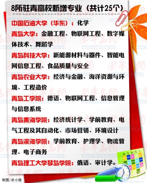 近日教育部公布了2012年度高等學(xué)校專業(yè)設(shè)置備案或?qū)徟Y(jié)果的通知,全國新設(shè)或調(diào)整了2610個(gè)專業(yè),其中有258個(gè)專業(yè)沒有通過審批,今年不予招生;全國共有51所高校換了新名。其中,中國石油大學(xué)(華東)等8所駐青高校又新增了本科專業(yè),共計(jì)25個(gè)。