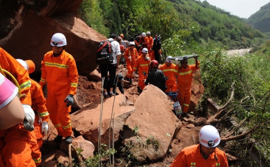 4月20日,因地震造成山體滑坡,道路受阻,救援人員徒步趕往救援現(xiàn)場。