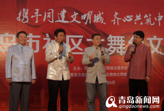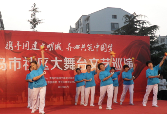 ????既然是在自己社區(qū)的演出,當(dāng)然不能少了咱們自己的節(jié)目,社區(qū)的健身球隊(duì)和太極拳隊(duì)早已操練多時(shí),上臺(tái)一亮相,就博得了臺(tái)下觀眾的滿堂彩。而青島歌舞劇院則為居民精心送上了群口相聲《青島話大挑戰(zhàn)》、山東琴書和河南墜子聯(lián)唱《十佳市民光彩照人》、小品《爭(zhēng)與讓》、男聲獨(dú)唱《左鄰右舍》和讓觀眾新奇的微小品《敬老》等等都贏得了一片掌聲和歡笑聲。