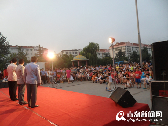 ????不到7點(diǎn),文化廣場(chǎng)的舞臺(tái)剛搭起來,臺(tái)下已經(jīng)座無虛席,居民們搖著蒲扇,拿著自家的馬扎,領(lǐng)著自家的孩子,將舞臺(tái)圍的水泄不通。“聽說今天是青島劇院的演出,以前在電視上看到在別的社區(qū)演過,今天能在自己家門口看到,當(dāng)然不能錯(cuò)過了。”一位姓張的大媽搶到了前排的位置,高興的說。