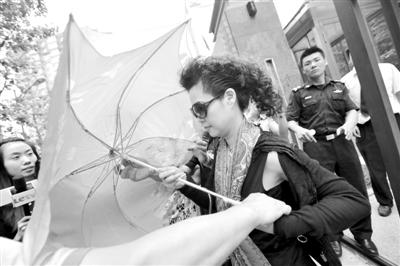 走出法庭的夢(mèng)鴿用雨傘遮擋記者拍照。昨天,李某涉嫌強(qiáng)奸一案在法院召開庭前會(huì)議,夢(mèng)鴿作為李某的法定代理人身份參加了會(huì)議。