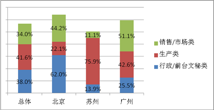 ?????? 調(diào)查顯示,企業(yè)的派遣崗位主要集中于“生產(chǎn)類”、“行政前臺文秘類”和“銷售類”等類型的崗位,其中,北京企業(yè)使用派遣的多為“行政前臺文秘類”崗位;蘇州企業(yè)在“生產(chǎn)類”崗位上的派遣用工最普遍;廣州企業(yè)派遣用工則多集中在“銷售類”崗位。(如圖3)