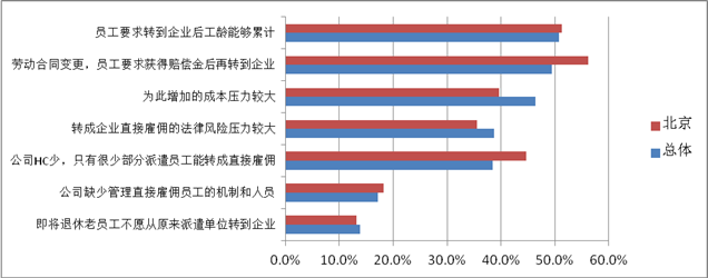 ?????? 需要指出的是,參與本次調(diào)研的企業(yè)中有近一半為外資企業(yè),他們使用派遣有其歷史原因,有些是由代表處變成分公司后一直延用派遣用工,很多員工被派遣的工齡很長,轉(zhuǎn)換后必然要求工齡累計,或要求對以前的工齡進(jìn)行補(bǔ)償,《勞動合同法實施條例》第10條也規(guī)定:勞動者非因本人原因從原用人單位被安排到新用人單位工作的,勞動者在原用人單位的工作年限合并計算為新用人單位的工作年限。同時,這些人可能也是公司的核心員工,若企業(yè)還想繼續(xù)留住這些員工,就需要接受員工的要求。
