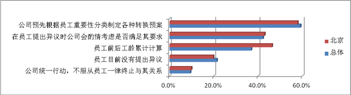 ????? 針對上述情況,大部分企業(yè)通常會預(yù)先根據(jù)員工重要性分類制定各種轉(zhuǎn)換預(yù)案,并在員工提出異議時酌情考慮是否滿足其要求。調(diào)查顯示,在面對員工提出累計工齡的需求中,全國大約70%的企業(yè)會給予支持,北京的企業(yè)對此的支持率達(dá)到90%以上。如圖6
