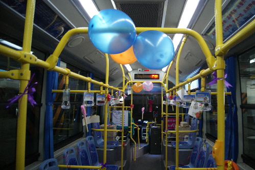 ????這輛裝飾成傳統(tǒng)“七夕”風(fēng)格的公交車。車頭掛著情人節(jié)專車的牌子。車廂內(nèi),綠葉鮮花纏繞扶手,車內(nèi)的立柱扶手,全部被紅色的絲帶包裹起來,象征月老紅線的紅色絲繩。坐在車廂里,有種置身于晴朗夏日夜里,天空繁星閃耀,看銀河里牽牛織女星跨越天河相遇的感覺。