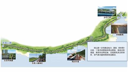 ????“六點(diǎn)一園”:石老人健身區(qū)的俯瞰點(diǎn)、熊牧場(chǎng)對(duì)面的“一覽觀?!秉c(diǎn)、石老人觀光園對(duì)面的“憑欄觀?!秉c(diǎn)、陽光山莊南側(cè)的“云影趣廊”點(diǎn)、西姜加油站西的“觀海聽濤”點(diǎn)、南姜社區(qū)邊的“城市花園”和沙子口灣的“依堤踏?!秉c(diǎn) 數(shù)字嶗山路