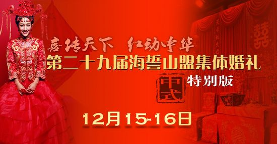 ????根據(jù)海誓山盟組委會的最新介紹,第二十九屆海誓山盟集體婚禮的布置現(xiàn)場,將打破以往的模式,現(xiàn)場主題將采用傳統(tǒng)的中國紅,展現(xiàn)濃郁的東方風(fēng)情?,F(xiàn)場搭建中,大紅燈籠高高掛起,紅色喜字貼滿全場,一場別開生面的婚典,就在12月拉開帷幕。據(jù)本次婚禮的策劃師介紹,隨著時下中國風(fēng)的大肆流行,許多新人在咨詢的時候,都在主動詢問是否可以舉辦中式婚禮,因此,策劃組在籌劃這場婚禮時,就將全面鋪開民族風(fēng)。