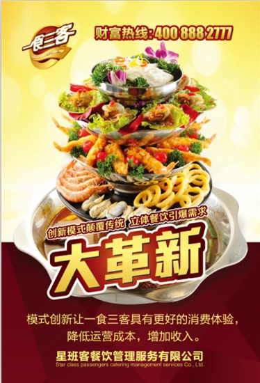 整合多方面的優(yōu)勢,合理利用時間和空間,一食三客全天賺錢,餐飲改革帶來與眾不同的就餐新體驗。一食三客使得營業(yè)時間的大大提升,憑借多層轉(zhuǎn)轉(zhuǎn)鍋和太囧杯的獨(dú)家優(yōu)勢,從而實現(xiàn)了早上蒸類、湯類、粥類套餐、午間晚間全系套餐、其他休閑時段太囧杯套餐,這大大提升了店面、設(shè)備、人員的利用率,降低了消耗,同時全天候的營業(yè)使得銷售額大大翻倍。讓火鍋店利潤成倍增多,生意一天更比一天好。