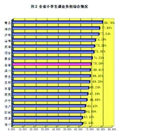 ????小學生課業(yè)負擔調查結果顯示,全省符合相關規(guī)定的綜合比例為70.36%。青島、濰坊、濟南、淄博、威海、煙臺、泰安等7市超過全省平均水平,課業(yè)負擔相對較輕。調查顯示,青島市的比例最高為80.76%,小學素質教育工作開展較好,學生課業(yè)負擔最輕;德州、菏澤、聊城、臨沂、濟寧、萊蕪、東營、日照、棗莊、濱州等10市低于全省平均水平,小學生課業(yè)負擔較重。其中德州市和菏澤市的比例最低為62.43%,小學素質教育落實情況最差,小學生課業(yè)負擔最重。