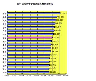 ????調查顯示,2013年度山東省普通中小學生課業(yè)負擔情況符合規(guī)定情況的綜合比例是64.17%,從全省17地市情況看,濰坊、威海、青島、淄博、濟南、萊蕪、煙臺、日照、濱州等9市超過全省平均水平,普通中小學生的課業(yè)負擔相對較輕,其中濰坊市的比例最高為73.04%,學生課業(yè)負擔最輕,青島學生的課業(yè)負擔在全省第三輕。德州、菏澤、聊城、臨沂、濟寧、東營、棗莊、泰安等八市低于全省平均水平,其中德州市最低為57.56%,學生課業(yè)負擔最重。