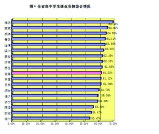 ????高中學生課業(yè)負擔調查結果顯示,全省符合相關規(guī)定的綜合比例為61.35%。濰坊、萊蕪、威海、青島、淄博、濱州、泰安、濟南、棗莊等9市超過全省平均水平,以上各市高中學生課業(yè)負擔相對較輕。其中濰坊市的比例最高為69.53%,該市高中學校素質教育工作落實較好,學生課業(yè)負擔最輕;德州、聊城、菏澤、濟寧、臨沂、煙臺、日照、東營等8市低于全省平均水平,以上各市高中學生課業(yè)負擔較重。其中德州市的比例最低為53.47%,聊城市的比例也較低為54.47%,兩市高中學校素質教育落實情況最差,高中學生課業(yè)負擔最重。結果顯示,超過50%的被調查學生和家長表示所在學校違反規(guī)定公布學生成績和名次。