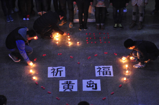 ????11月22日青島經(jīng)濟(jì)技術(shù)開(kāi)發(fā)區(qū)(黃島區(qū))發(fā)生漏油爆燃事故,事故造成大量人員傷亡。24日下午,青島濱海學(xué)院學(xué)子在大學(xué)生活動(dòng)中心(行德樓)小廣場(chǎng)舉行祈?;顒?dòng),為在黃島輸油管道爆燃事故中的遇難者默哀、為黃島祈福。