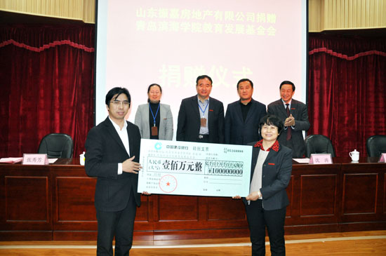 ????2013年12月3日下午,山東振嘉房地產(chǎn)有限公司向青島濱海學(xué)院教育發(fā)展基金會(huì)捐贈(zèng)儀式在青島濱海學(xué)院學(xué)術(shù)報(bào)告廳舉行,該公司向?qū)W校基金會(huì)捐贈(zèng)人民幣100萬(wàn)元,重點(diǎn)用于獎(jiǎng)勵(lì)和資助優(yōu)秀學(xué)生和貧困生學(xué)習(xí),這也是基金會(huì)建立以來(lái)收到的最大的單筆捐助。