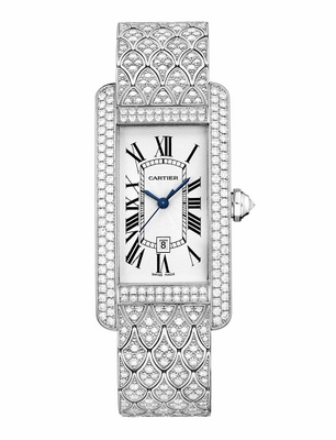 卡地亞Tank MC鏤空腕表 ????Tank Anglaise腕表自誕生伊始,便以其一體化的簡約造型俘獲了無數(shù)名媛淑女的芳心。在今年推出的新款設(shè)計中,明媚的淺蓮紅色點燃冬日的火熱激情,標(biāo)志性垂直表耳上鑲嵌的華麗美鉆,更閃耀了年輕女性的俏麗身姿,為隆冬帶來一抹別樣活力。 ????女性的柔美之韻在另一款Tank Américaine腕表中被展現(xiàn)得淋漓盡致。蛇形鏈條設(shè)計的表帶以性感曲線流露神秘魅力,如絲緞般貼合手腕的弧度展現(xiàn)了完美的人體工程學(xué),同時不失尊貴典雅。鋪鑲的璀璨鉆石把端莊的腕表妝點成最華彩的珠寶,圣誕夜的矚目焦點躍然而生。