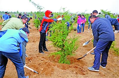 ????昨天是我國(guó)第36個(gè)植樹節(jié),我市共有45.63萬(wàn)人參加了當(dāng)天的義務(wù)植樹勞動(dòng),拉開了全年造林生產(chǎn)的序幕。圖為紅島經(jīng)濟(jì)區(qū)組織近千人赴河套萬(wàn)畝生態(tài)間隔林場(chǎng)參加義務(wù)植樹活動(dòng)。
