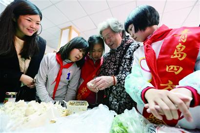 ????每天下午3時,小區(qū)的空巢老人孫大爺總會坐著小馬扎在小學(xué)門口,看著別的爺爺奶奶拎著小水壺,挎著小書包,牽著孫子孫女的手,滿臉笑容地往家里走,老人的眼睛里寫滿了寂寞。昨天由四方實驗小學(xué)6名80后老師組成的早報敬老精英志愿者團隊,帶著42名小學(xué)生走進社區(qū),跟那里的空巢老人們一起包餛飩吃餛飩,將孩子們的一份孝心傳遞到老人心中?!拔覀兿MM織孩子們跟空巢老人定期互動,慰藉老人對遠在外地孫子孫女的思念之情?!敝驹刚叻侥壤蠋煼Q。