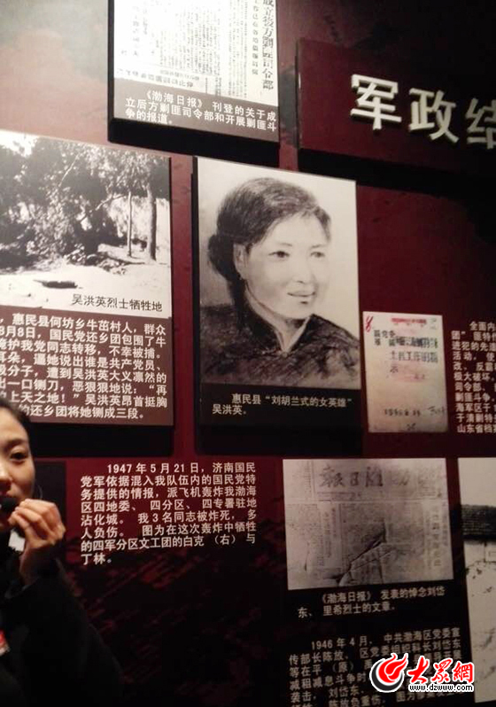 講解員徐徐敘述著那些年那些人那些事,那些血雨腥風(fēng)中的浩然正氣,“老渤海”精神,是大寫的立體的,是一個(gè)又一個(gè)無私無畏的革命先烈們用鮮血書就的。它是山東省第一個(gè)農(nóng)村基層黨支部——壽光黨支部的星星之火;是山東省第一次農(nóng)民暴動(dòng)——博興“八四”暴動(dòng)的勇敢嘗試;是博興縣共產(chǎn)黨員李天佑為掩護(hù)向上級黨組織請示匯報(bào)工作的縣委聯(lián)絡(luò)員李相韓,自稱是“李相韓”而慷慨“替死”的悲壯大義;是馮景恩被捕后執(zhí)行槍決居然三槍未死,被群眾救回康復(fù)后毅然重新投入抗日救國事業(yè)的執(zhí)著不悔;是一馬三司令,馬氏三兄弟先前仆后繼抗日救國、為國捐軀的壯懷激烈;是大生產(chǎn)運(yùn)動(dòng)時(shí),渤海區(qū)人民生產(chǎn)自救的自強(qiáng)不息;是渤海人民依托青紗帳作掩護(hù),跟日本鬼子進(jìn)行斗爭的艱苦卓絕;是尹洪英送郎參軍,“好父母教兒拿起槍,好妻子送郎上戰(zhàn)場”的無怨無悔;是樂陵縣常大娘帶領(lǐng)全家挖地道、地洞,先后掩護(hù)60多名黨政干部的機(jī)智淡定;是吳洪英為掩護(hù)我黨同志轉(zhuǎn)移,面對敵人的嚴(yán)刑拷打始終緊閉雙唇,最后在鍘刀下從容赴死的錚錚鐵骨;是解放戰(zhàn)爭期間,渤海區(qū)共抽調(diào)支前民工達(dá)81.9萬人次,有17.2萬名渤海區(qū)人民的優(yōu)秀子弟光榮參軍,喊出了“傾家蕩產(chǎn)、支援前線”的口號的渤海人共籌集軍糧10.45億斤的無私奉獻(xiàn)。一個(gè)個(gè)鮮活的生命一頁頁輝煌的革命史,渤海區(qū)的先烈們用可歌可泣的事跡闡釋著“老渤?!本?,踐行著“老渤海”精神。