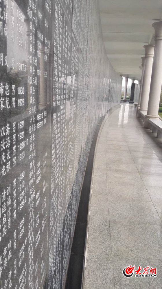 長達(dá)162米的渤海革命老區(qū)烈士英名錄碑廊,四大塊黑色大理石碑上密密麻麻地鐫刻著55308名烈士的名字以及他們的籍貫、職務(wù)和犧牲地點(diǎn)。