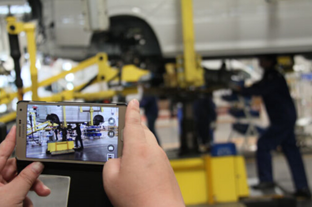 在機器人的幫助下,工人將發(fā)動機安裝到車輛內(nèi)