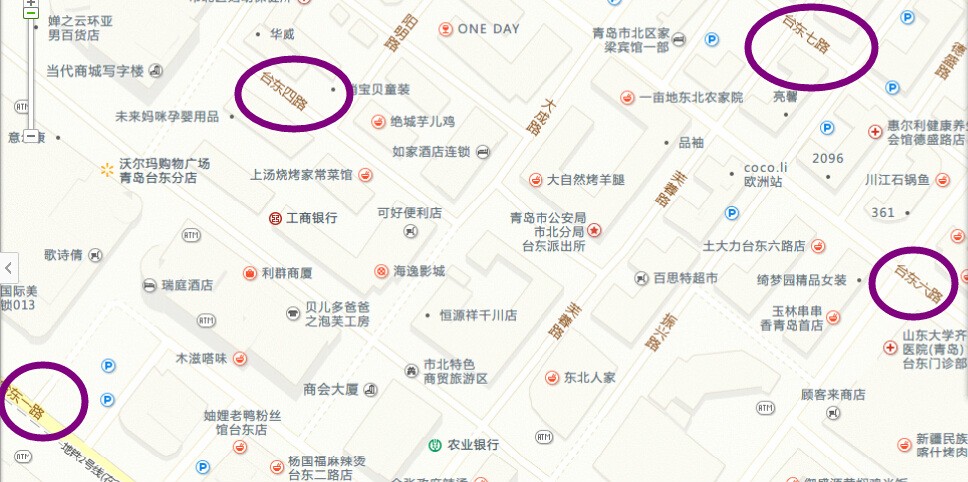????由臺東一路到臺東八路,形成一個長方形的“口”字,從登州路通到海泊橋的威海路從這個“口”字中間穿過,使得臺東形成一個“中”字。
