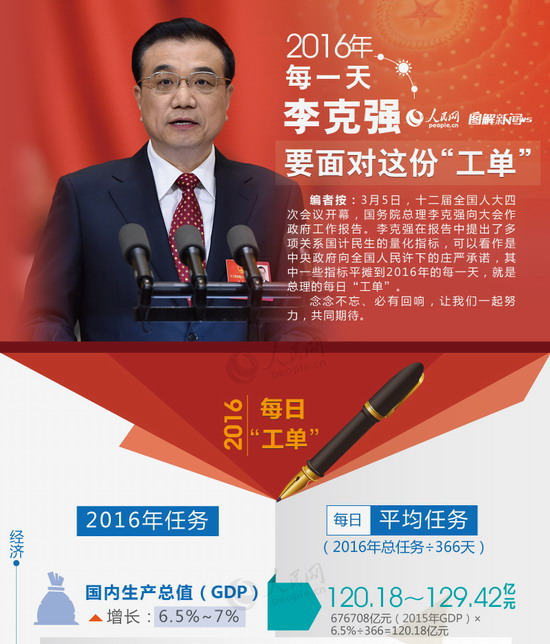人民網(wǎng)北京3月5日電(記者趙艷紅 實(shí)習(xí)生顧雯)3月5日,十二屆全國(guó)人大四次會(huì)議開(kāi)幕,國(guó)務(wù)院總理李克強(qiáng)向大會(huì)作政府工作報(bào)告。李克強(qiáng)在報(bào)告中提出了就業(yè)、減負(fù)、脫貧、修路等多項(xiàng)關(guān)系國(guó)計(jì)民生的量化指標(biāo),其中一些指標(biāo)平攤到366天,就是總理2016年的每日“工單”。