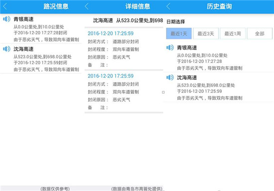 首次整合青島市域范圍內13條高速公路實時路況和54個收費站封閉開通的實時信息(濟青高速路況信息暫無,正在協(xié)調接入中)。