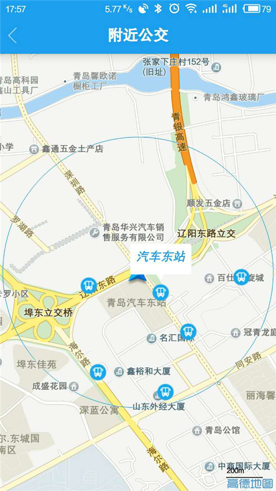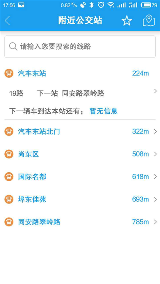 方便用戶查找附近的公交車站;也可在地圖上選取附近公交車站,查看途經該站點的各條公交線路上正在行駛的公交車數(shù)量和實時位置。