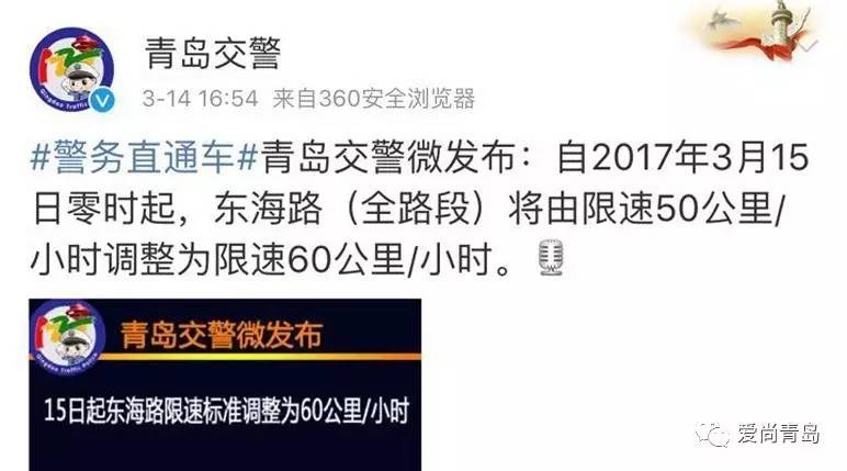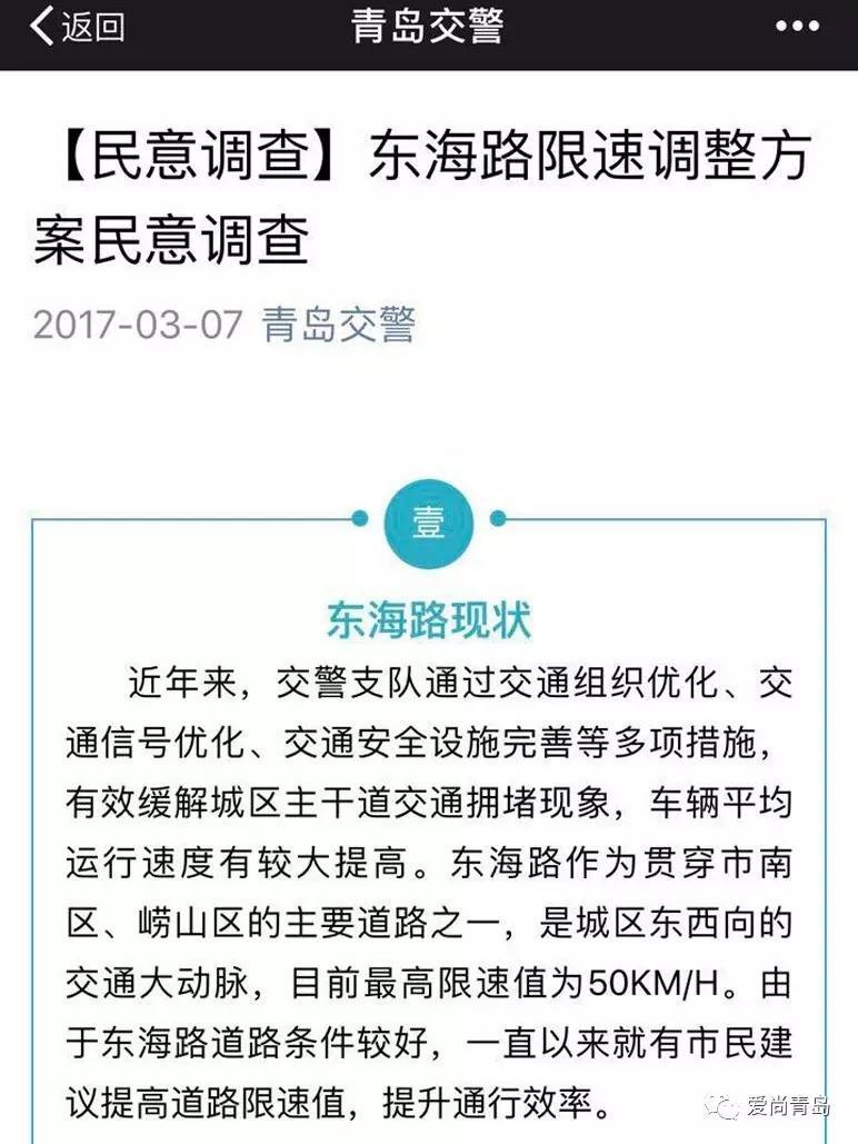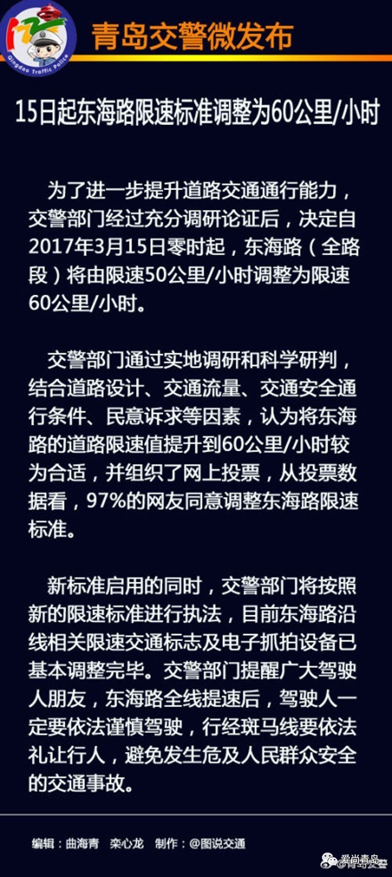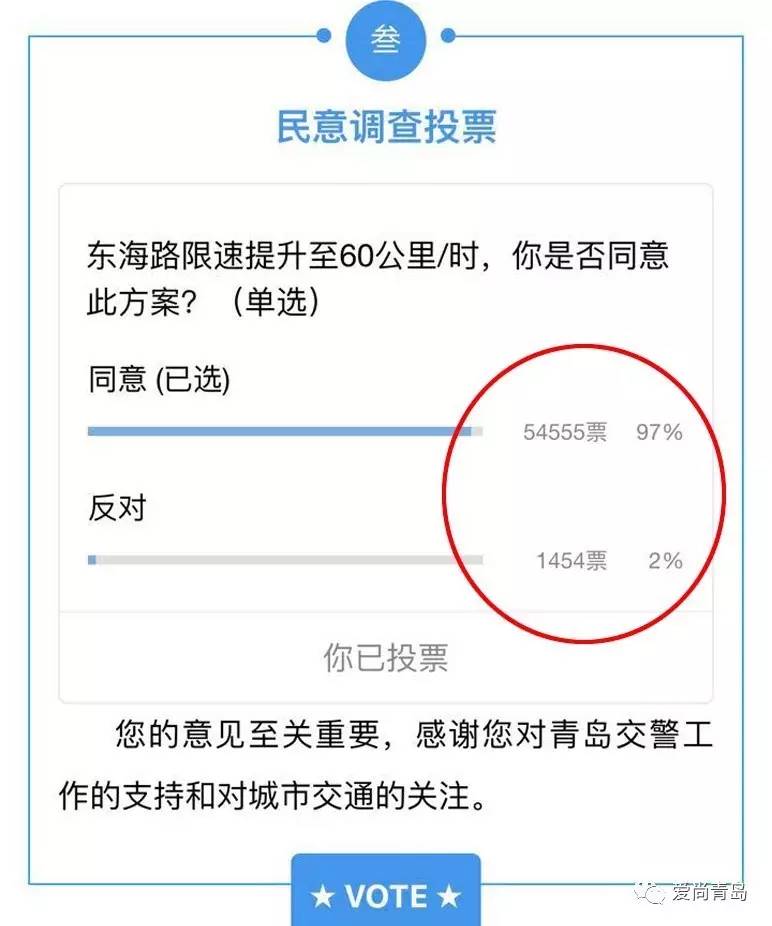 青島交警3月7日通過(guò)官方微信調(diào)查:97%的網(wǎng)民同意東海路限速提升至60公里/小時(shí)。